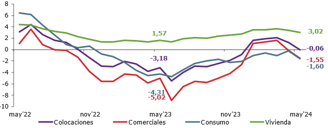 La caída de las colocaciones se explicó por la baja en la actividad de las colocaciones comerciales y de consumo, cuyas variaciones fueron de -1,55% y -1,60%, respectivamente. Por su parte, la cartera para la vivienda creció en un 3,02%.