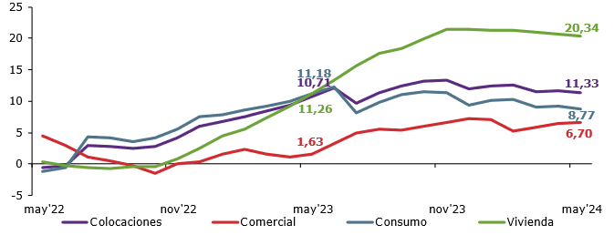 La cartera de consumo, que en mayo concentró el 70,73% del total, explicó mayormente la trayectoria de las colocaciones, registrando un incremento de 8,77% en 12 meses. La cartera comercial en tanto se expandió un 6,70% y la cartera de vivienda creció un 20,34%, ambas en 12 meses.
