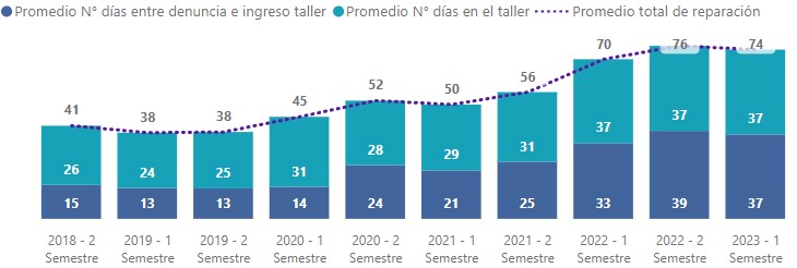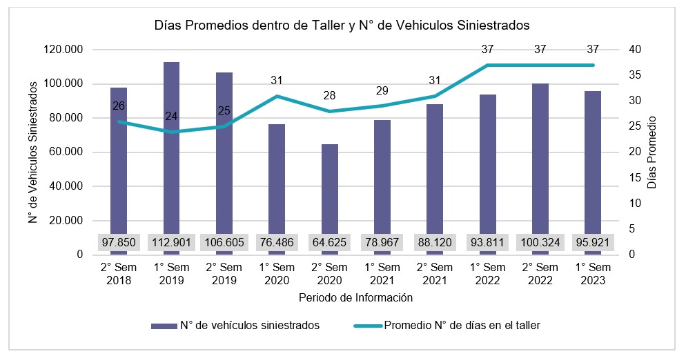 Por su parte, el tiempo promedio medido desde el ingreso al taller y hasta que el vehículo quedó disponible para retiro del asegurado alcanzó los 37 días, manteniendo la tendencia del año 2022.