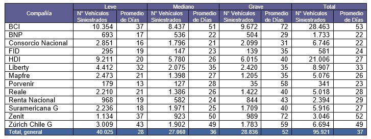 Como se observa en el siguiente cuadro, los tiempos de reparación por compañía de seguros varían significativamente dependiendo de la magnitud del daño del vehículo.