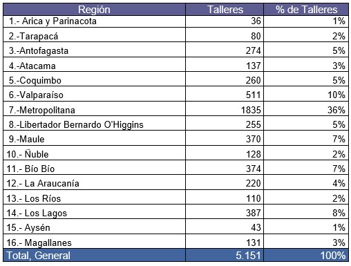 Al cierre de este reporte, se registran 5.151 convenios de compañías con talleres de reparación (los talleres pueden estar contabilizados en más de una compañía), registrando una tasa de 377 vehículos asegurados por convenio. Del total de talleres, el 36% se encuentra en la región metropolitana.