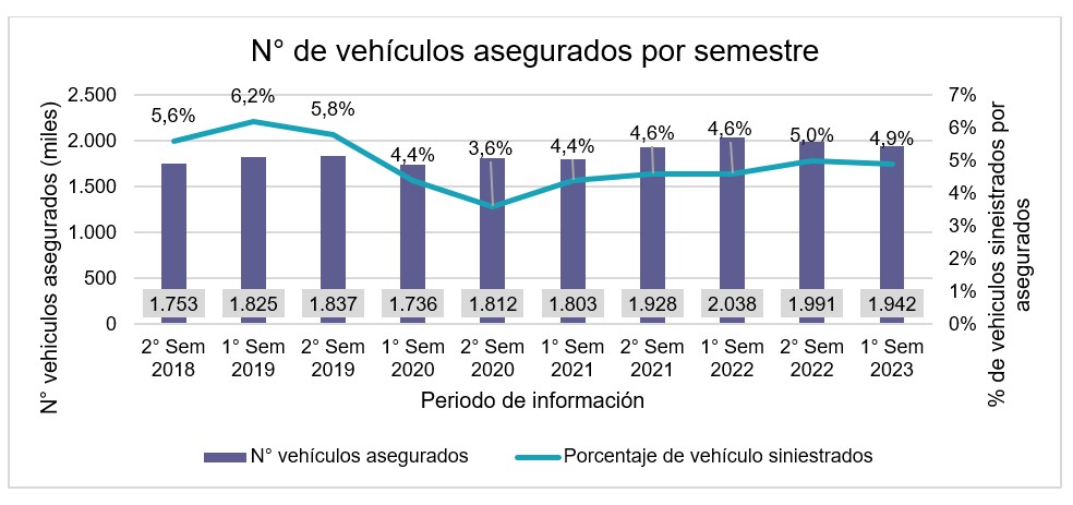 Por su parte, el número total de vehículos asegurados al primer semestre de 2023 es de 1.942.068, lo que significó una disminución de 49.245 vehículos respecto del semestre anterior. En tanto, la tasa de vehículos siniestrados por vehículos asegurados llegó a un 4,9%, levemente inferior al 5% del semestre anterior. Esta cifra considera a todos los tipos de vehículos no comerciales.