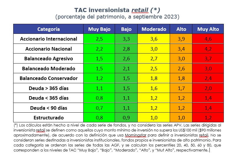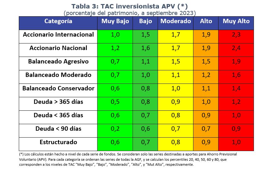 Para facilitar su comprensión, se presenta una tabla separada en colores, donde el rojo representa TAC "muy altas", esto es, aquellas que están en el 20% más alto de su categoría. En el otro extremo, en color verde, se representan las TAC "muy bajas" de cada categoría, es decir, aquellas que reflejan el 20% de menores costos en cada categoría.