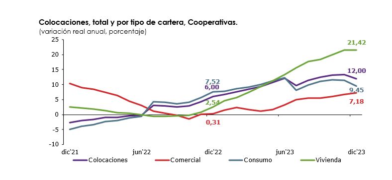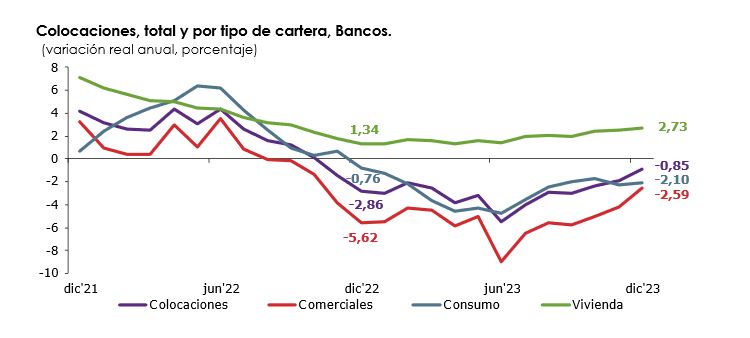 La cartera de consumo, que en diciembre concentró el 71,16% del total, explicó mayormente la trayectoria de las colocaciones, registrando un incremento de 9,45% en 12 meses. La cartera comercial en tanto se expandió un 7,18% en 12 meses y la cartera de vivienda creció un 21,42%.