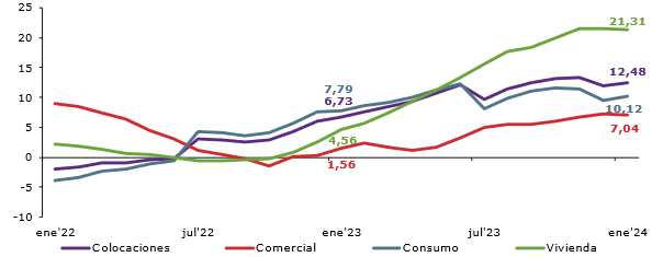 La cartera de consumo, que en enero concentró el 71,16% del total, explicó mayormente la trayectoria de las colocaciones, registrando un incremento de 10,12% en 12 meses. La cartera comercial en tanto se expandió un 7,04% y la cartera de vivienda creció un 21,31%, ambas en 12 meses.