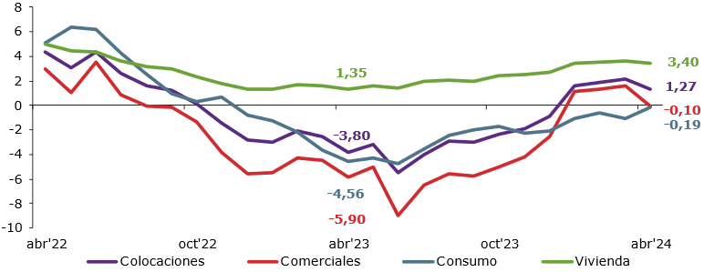 El alza de las colocaciones se explicó por el incremento de las colocaciones de vivienda, las que crecieron un 3,40% en 12 meses. Por su parte, las carteras comercial y consumo cayeron, registrando variaciones del -0,10% y -0,19%, respectivamente.