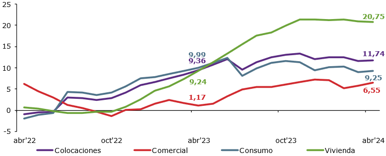 La cartera de consumo, que en abril concentró el 70,88% del total, explicó mayormente la trayectoria de las colocaciones, registrando un incremento de 9,25% en 12 meses. La cartera comercial en tanto se expandió un 6,55% y la cartera de vivienda creció un 20,75%, ambas en 12 meses.