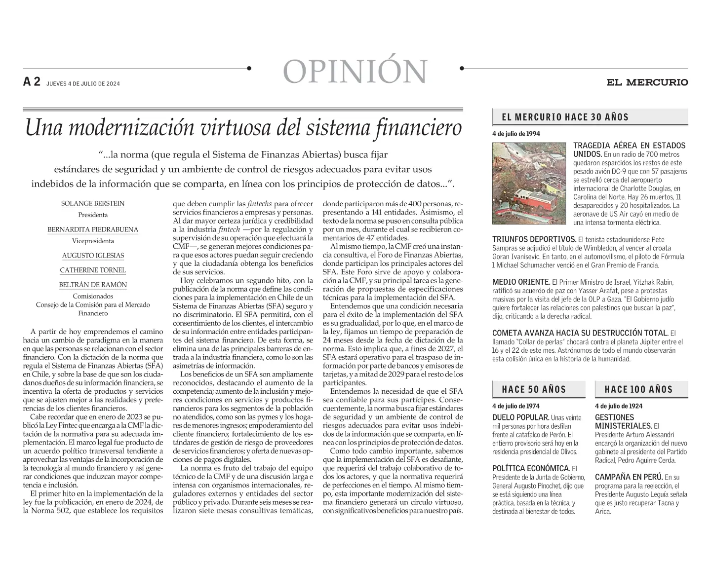 Consejo explica los beneficios del Sistema de Finanzas Abiertas tras la emisión de su normativa. El Mercurio, 4 de julio de 2024.