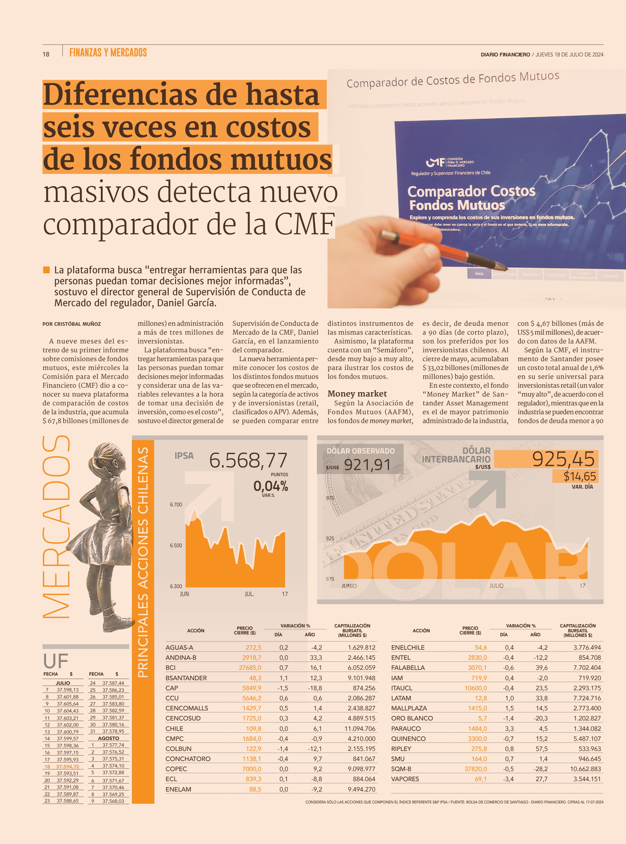 Nota del Diario Financiero sobre la nueva plataforma comparadora de Fondos Mutuos de la CMF. 18 de julio de 2024.