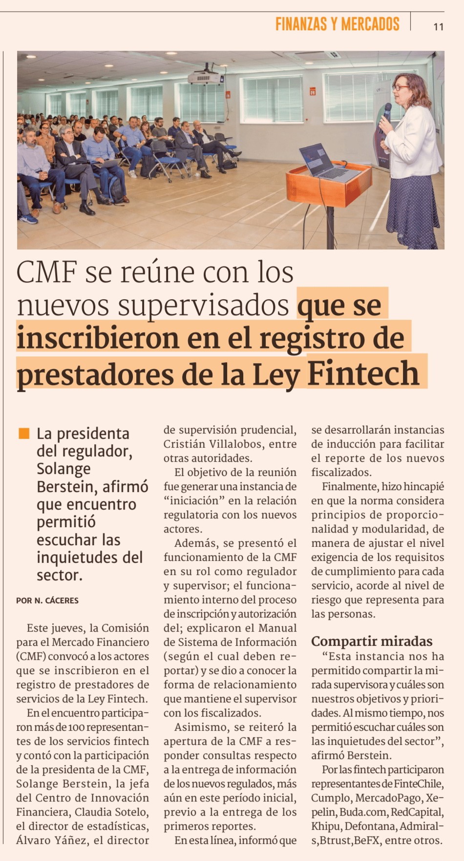 Nota del Diario Financiero sobre el primer encuentro de la CMF con los prestadores de servicios financieros regulados por la Ley Fintec. 7 de febrero de 2025.