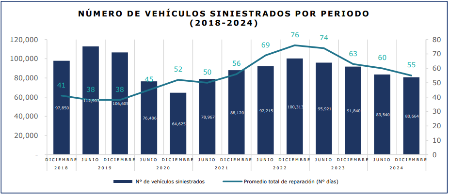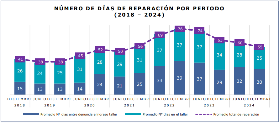 Entre junio y diciembre de 2024, el tiempo promedio entre la denuncia y la disponibilidad del vehículo para retiro por parte del asegurado fue de 55 días, menor al promedio de 60 días registrado en el primer semestre. En términos anuales, el tiempo promedio de 2024 fue de 58 días, una disminución de 11 días en comparación con 2023.