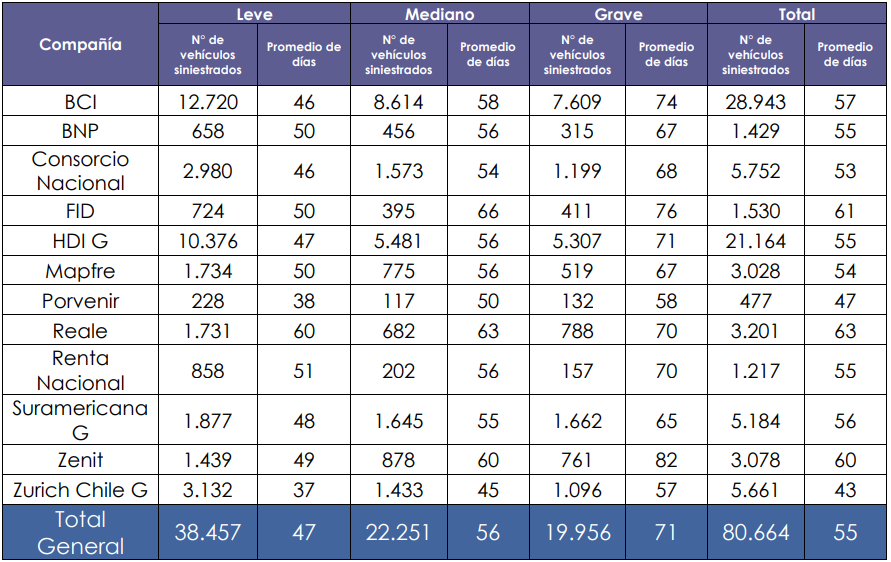 Como se observa en el siguiente cuadro, los tiempos de reparación por compañía de seguros varían significativamente dependiendo de la magnitud del daño del vehículo.