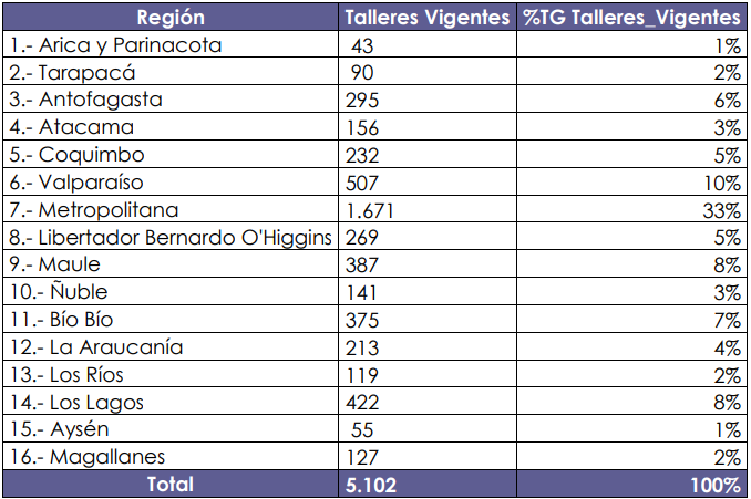 Al cierre de este reporte, se registran 5.102 talleres de reparación en convenio con las compañías (los talleres pueden estar contabilizados en más de una compañía). Del total de talleres, el 33% se encuentra en la Región Metropolitana.